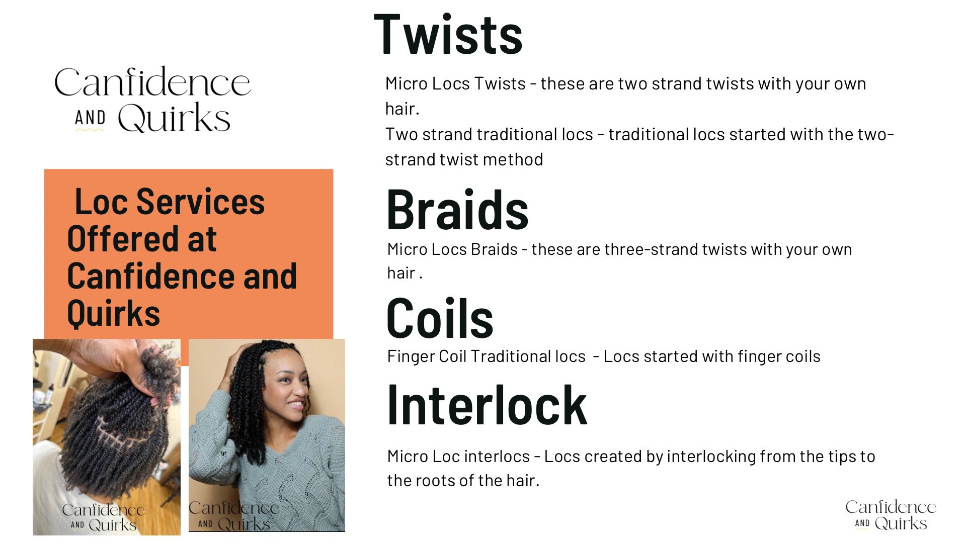 “I absolutely love my micro locs. My entire experience at Canfidence and Quirks Beauty was absolutely amazing. During my initial consultation Shay gave me all the information and options I needed to know about the micro loc journey. Prior to our consultation I felt confident that this was what I wanted. But after our conversation I KNEW that I had found the perfect person to start this journey with. She was so patient with all my questions and concerns.”